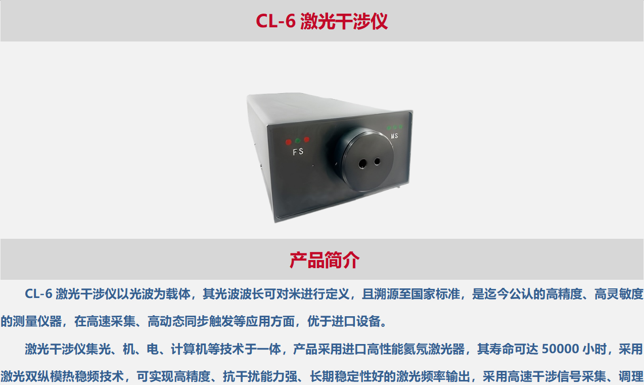 CL-6激光干涉仪以光波为载体,其光波波长可对米进行定义,且溯源至国家标准,是迄今公认的高精度、高灵敏度的测量仪器,在高速采集、高动态同步触发等应用方面,优于进口设备。