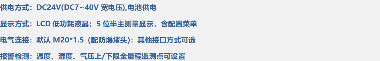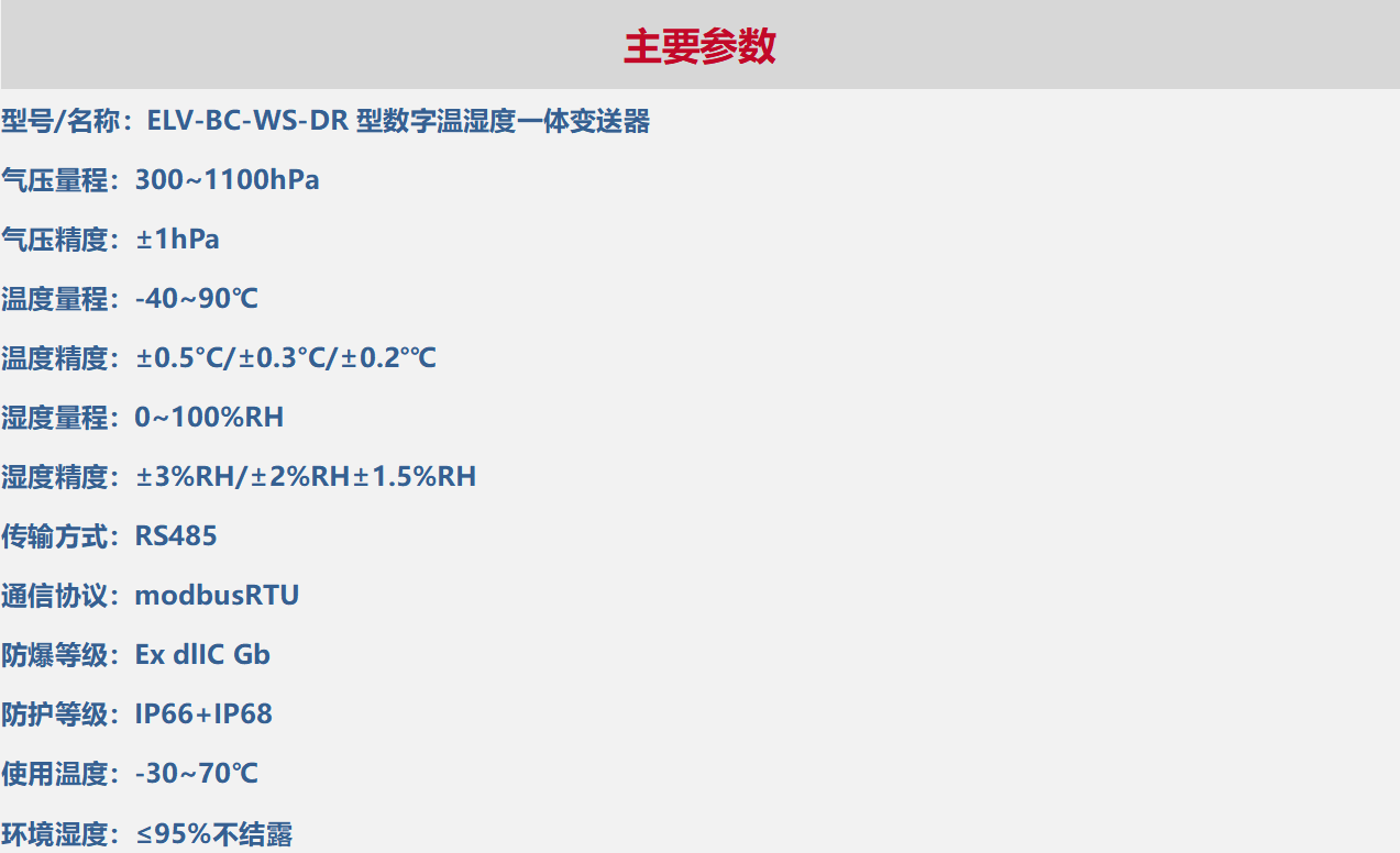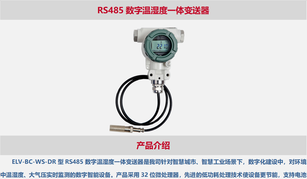 ELV-BC-WS-DR型RS485数字温湿度一体变送器是我司针对智慧城市、智慧工业场景下,数字化建设中,对环境中温湿度、大气压实时监测的数字智能设备。产品采用32位微处理器,先进的低功耗处理技术使设备更节能,支持电池方式供电使用。变送器外形简洁、显示直观、操作方便,具备耐腐蚀、耐振动、抗冲击等特性。