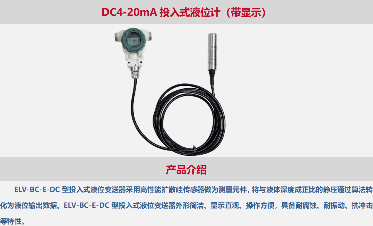 ELV-BC-E-DC型投入式液位变送器采用高性能扩散硅传感器做为测量元件,将与液体深度成正比的静压通过算法转化为液位输出数据。ELV-BC-E-DC型投入式液位变送器外形简洁、显示直观、操作方便,具备耐腐蚀、耐振动、抗冲击等特性.