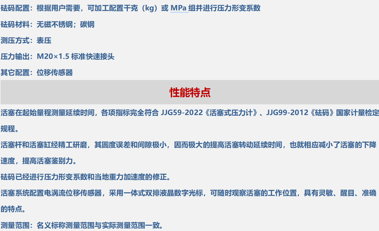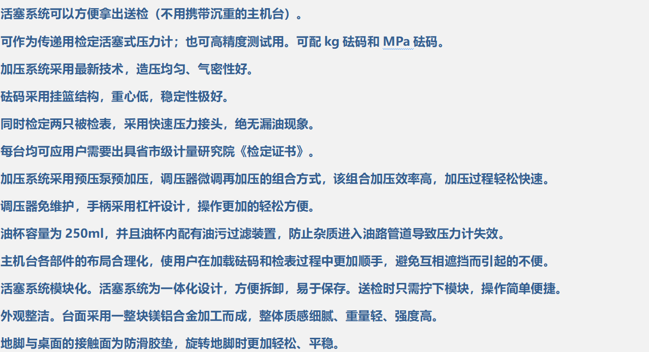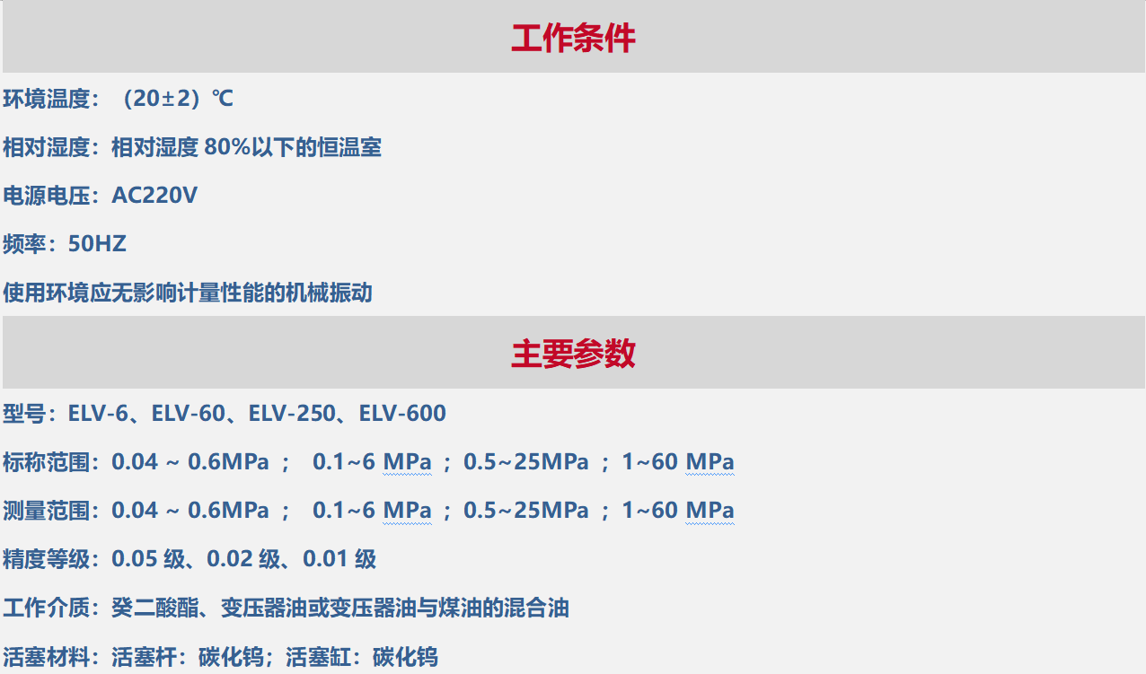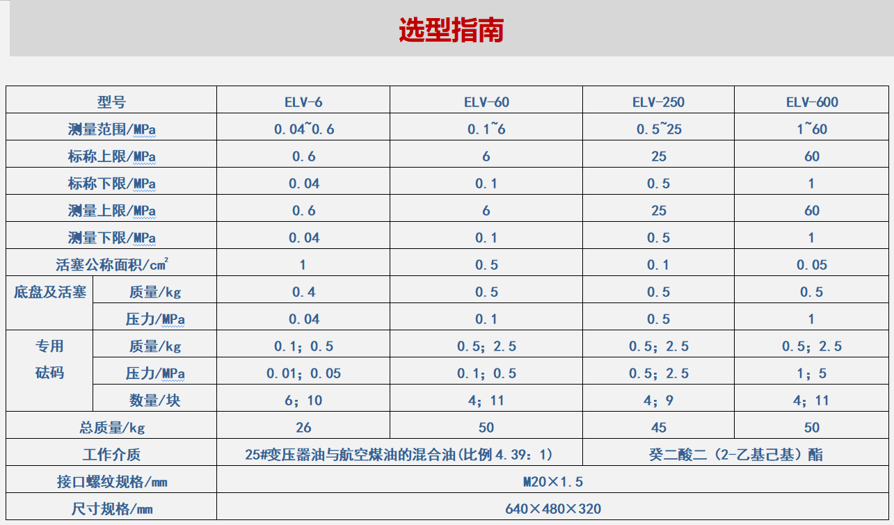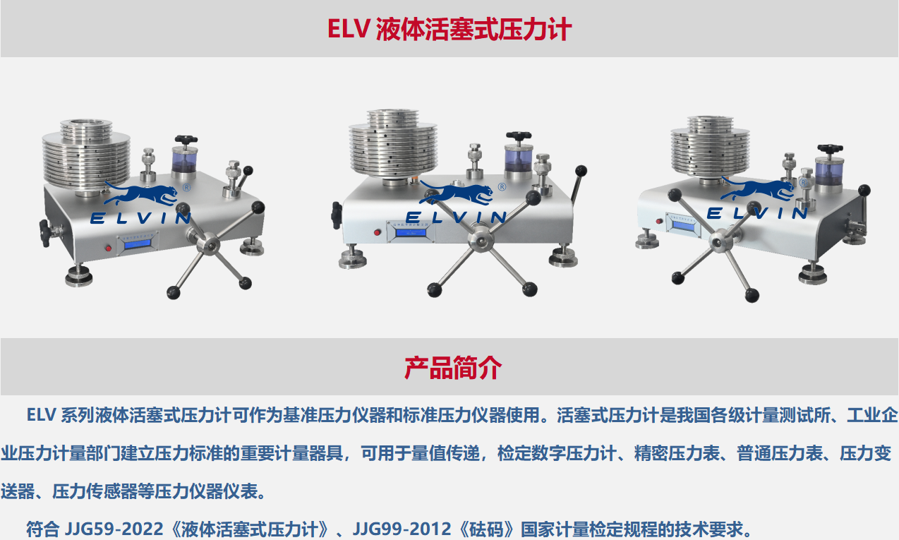 ELV系列液体活塞式压力计可作为基准压力仪器和标准压力仪器使用。活塞式压力计是我国各级计量测试所、工业企业压力计量部门建立压力标准的重要计量器具,可用于量值传递,检定数字压力计、精密压力表、普通压力表、压力变送器、压力传感器等压力仪器仪表。