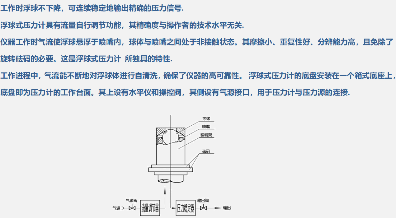 Y047/Y055系列浮球式压力计是以压缩空气或氮气作为压力源,以精密浮球处于工作状态时的球体下部的压力作用面积为浮球有效面积的一种气动负荷式压力计。如上图所示,精密浮球置于筒形的喷嘴内部,专用砝码通过砝码架作用在球体的顶端,喷嘴内的气压作用在球体下部,使浮球在喷嘴内飘浮起来。当已知质量的专用砝码所产生的重力与气压的作用力相平衡时, 浮球式压力计便输出一个稳定而精确的压力值。