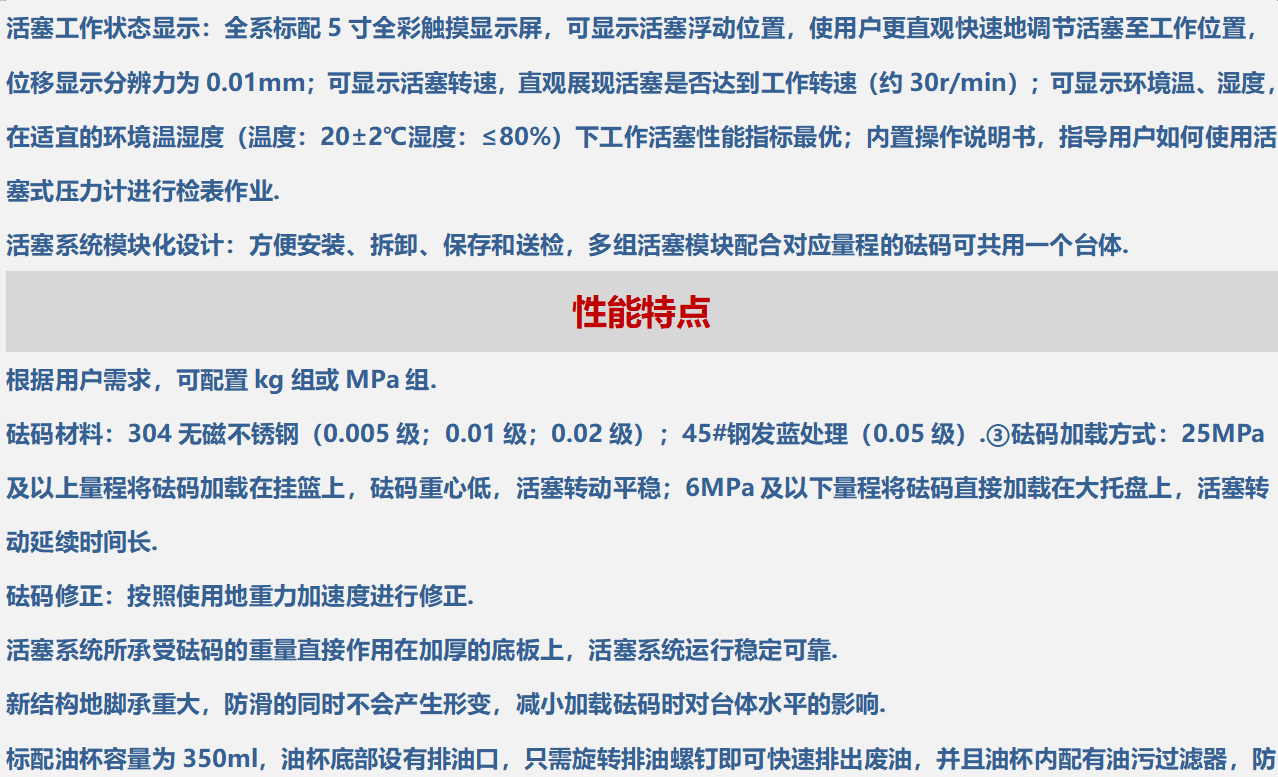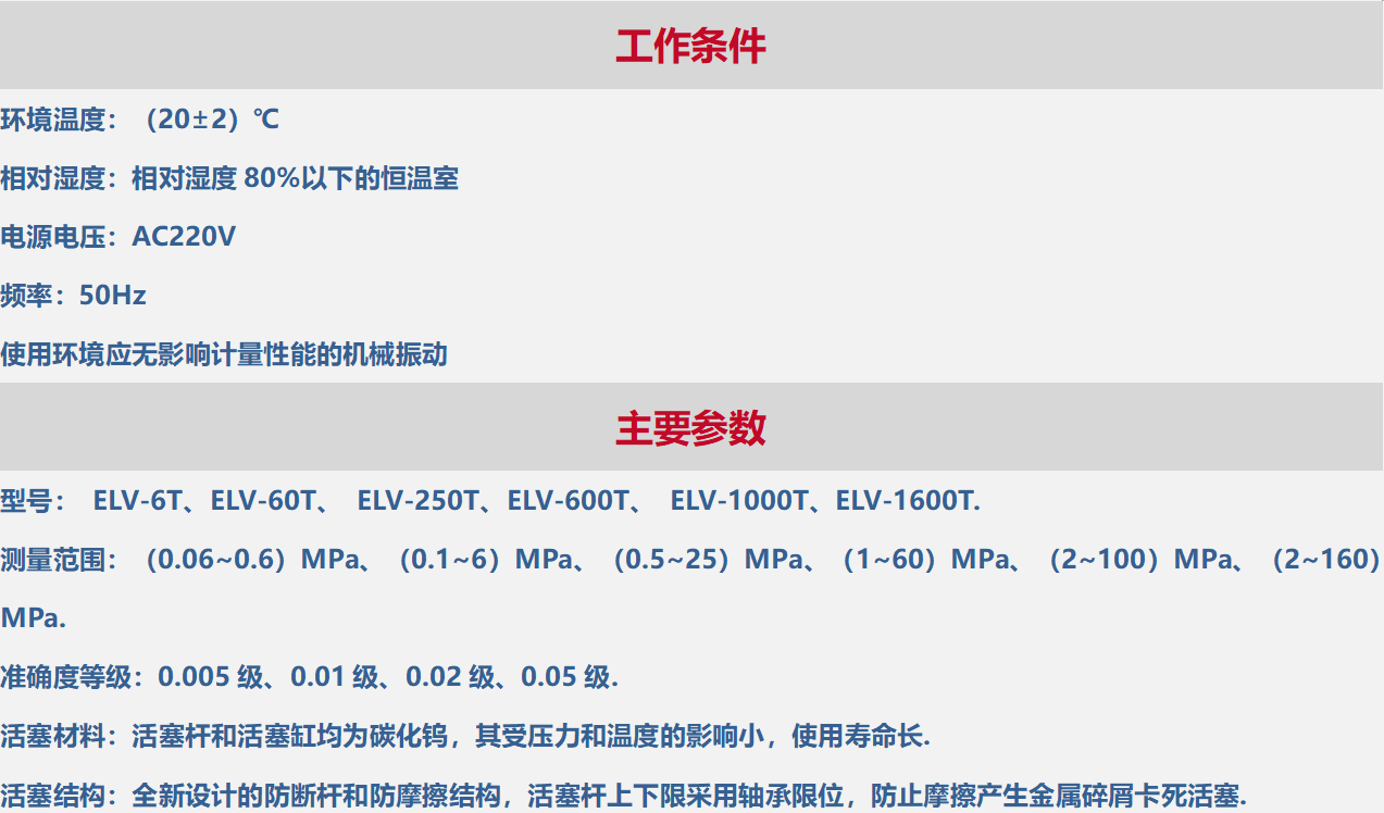 ELV系列液体活塞式压力计可作为基准压力仪器和标准压力仪器使用。活塞式压力计是我国各级计量测试所、工业企业压力计量部门建立压力标准的重要计量器具,可用于量值传递,检定数字压力计、精密压力表、普通压力表、压力变送器、压力传感器等压力仪器仪表。