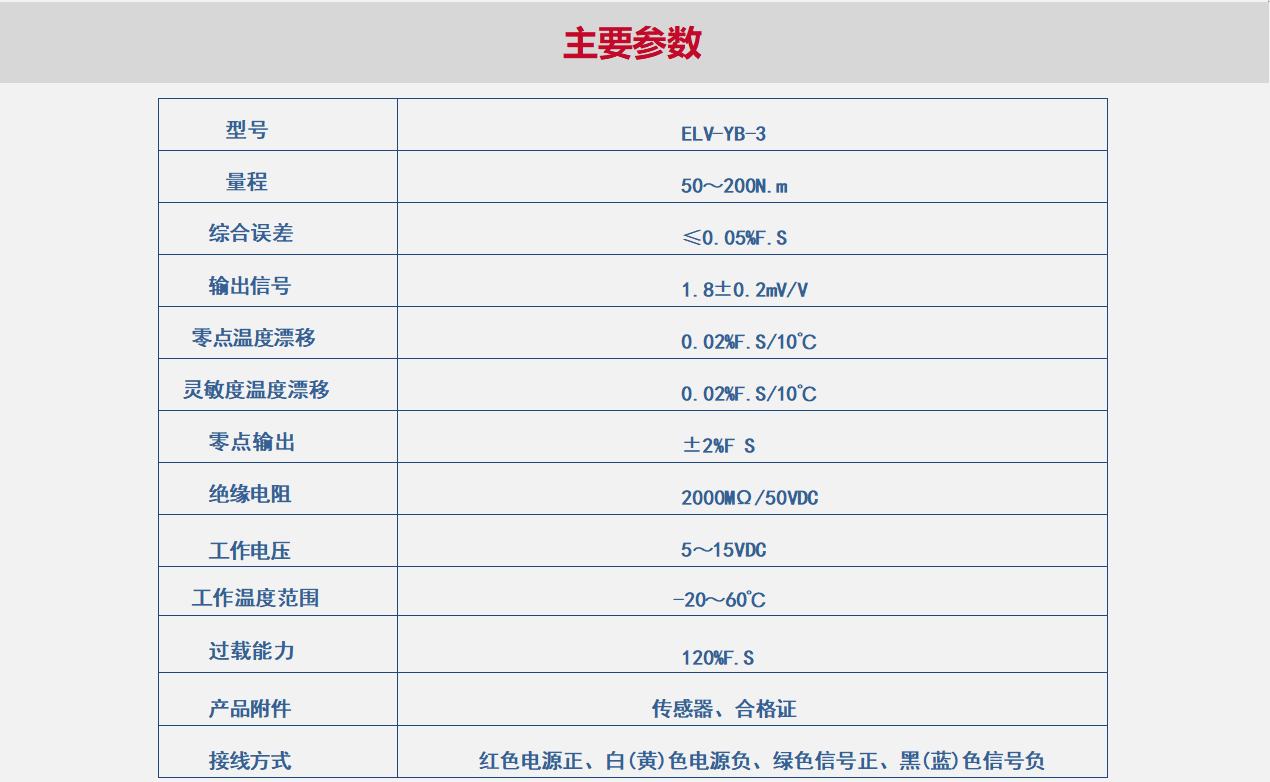 ELV-YB-3系列扭矩传感器适用于高精度扭矩工具、扭矩检测标 定装置等静态扭矩测量场合。两端采用方头及方孔连接,安装方便。可选 配变送器、测量仪表或数据采集系统。