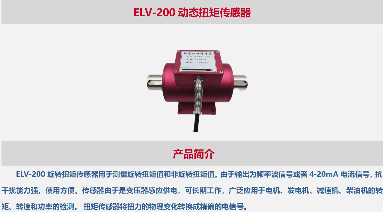 ELV-200旋转扭矩传感器用于测量旋转扭矩值和非旋转扭矩值。由于输出为频率波信号或者4-20mA电流信号,抗干扰能力强,使用方便。传感器由于是变压器感应供电,可长期工作,广泛应用于电机、发电机、减速机、柴油机的转矩、转速和功率的检测。 扭矩传感器将扭力的物理变化转换成精确的电信号。