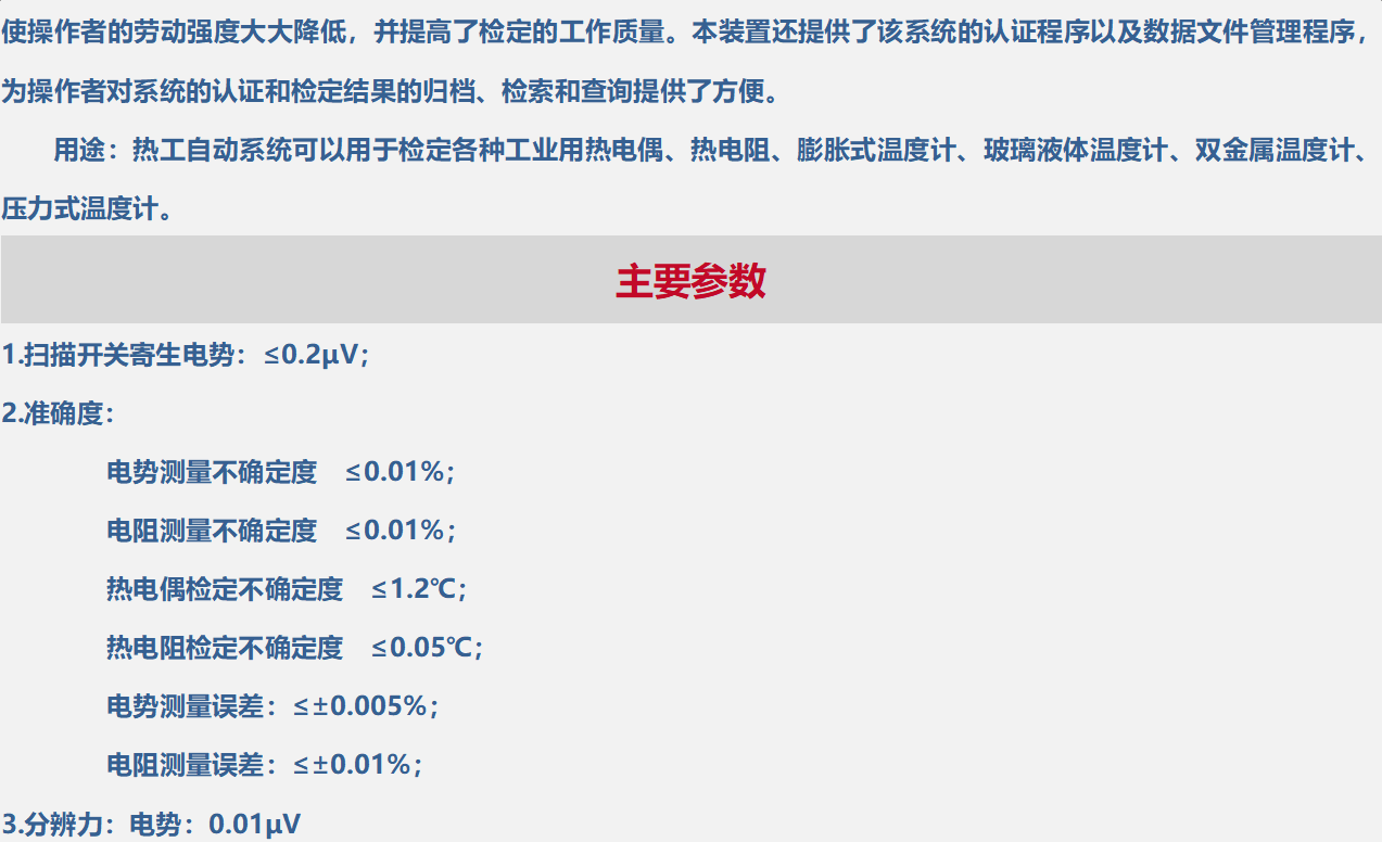 用途:热工自动系统可以用于检定各种工业用热电偶、热电阻、膨胀式温度计、玻璃液体温度计、双金属温度计、压力式温度计。