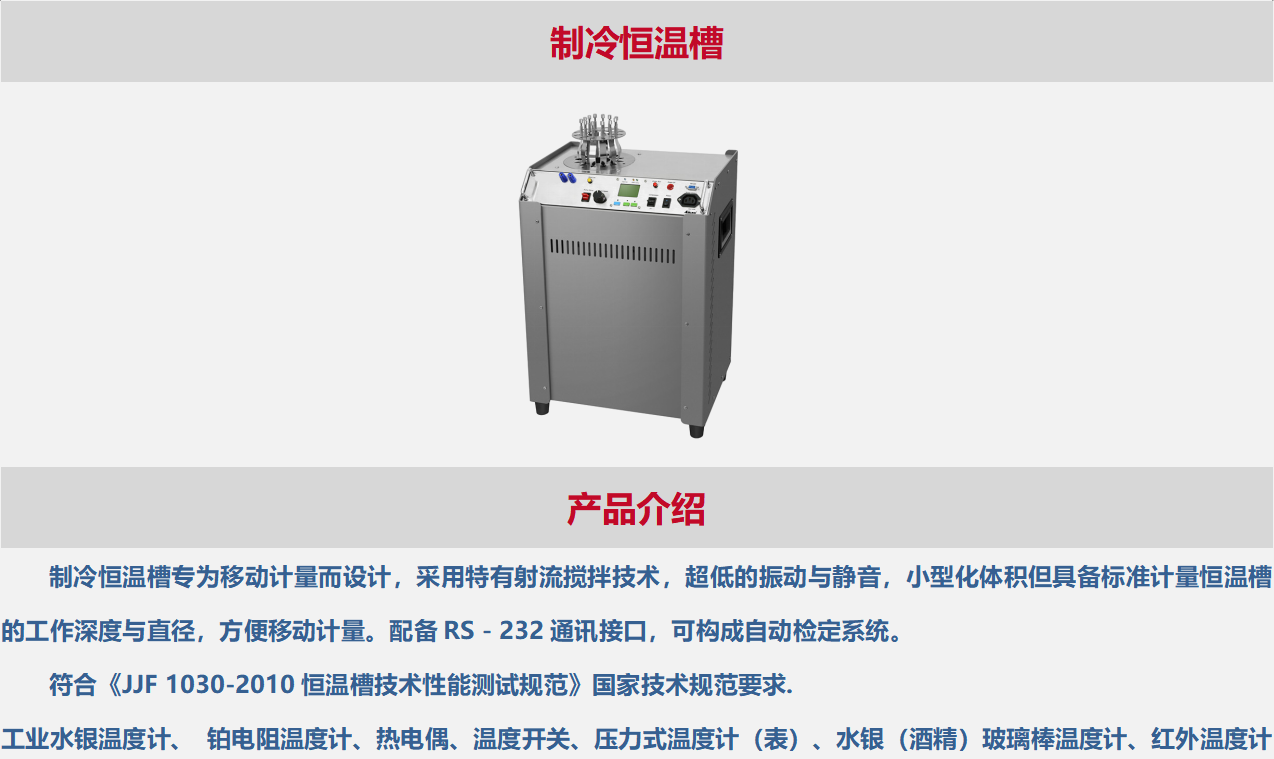 制冷恒温槽专为移动计量而设计,采用特有射流搅拌技术,超低的振动与静音,小型化体积但具备标准计量恒温槽的工作深度与直径,方便移动计量。配备RS-232通讯接口,可构成自动检定系统。