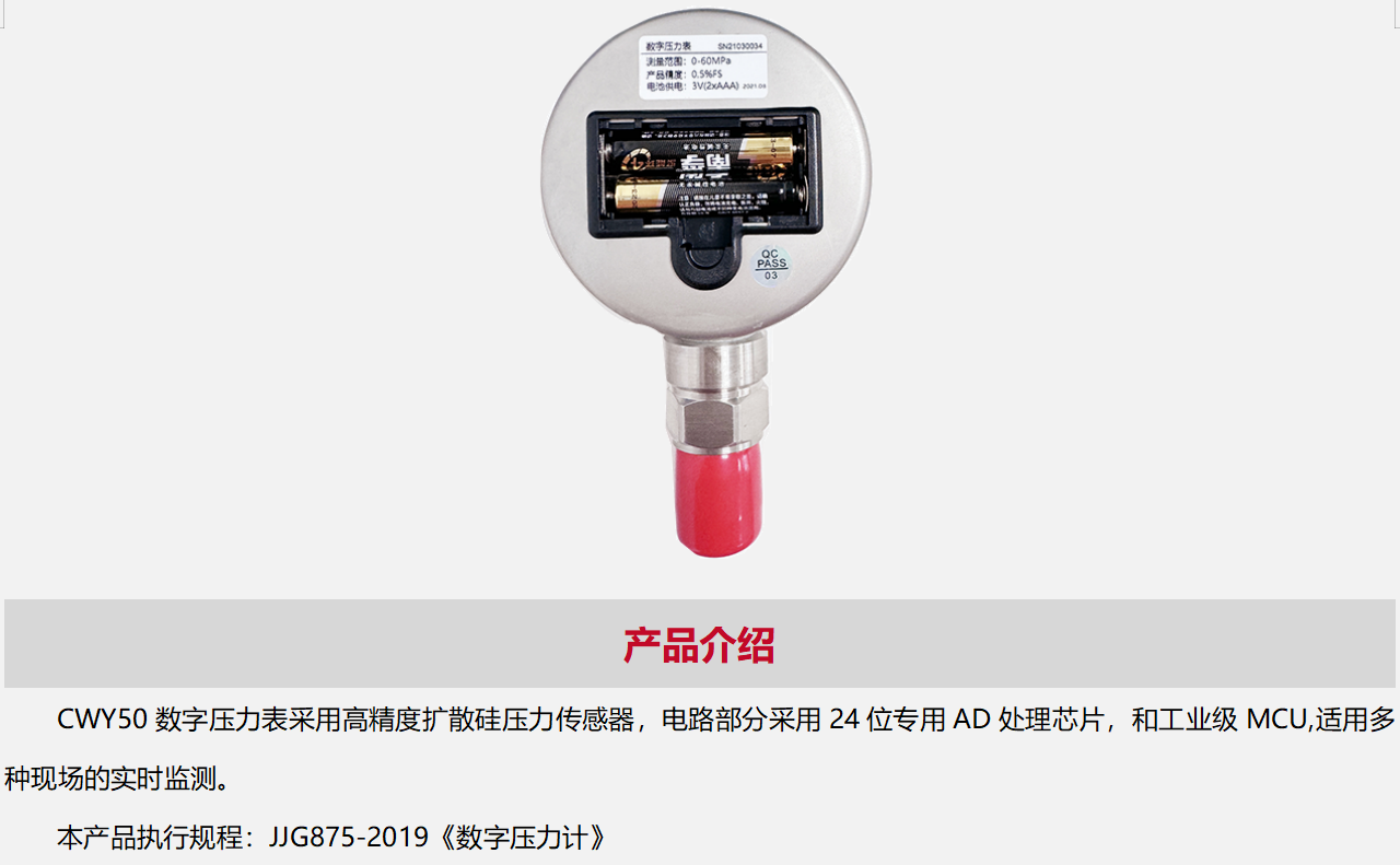 CWY50数字压力表采用高精度扩散硅压力传感器,电路部分采用24位专用AD处理芯片,和工业级MCU,适用多种现场的实时监测。