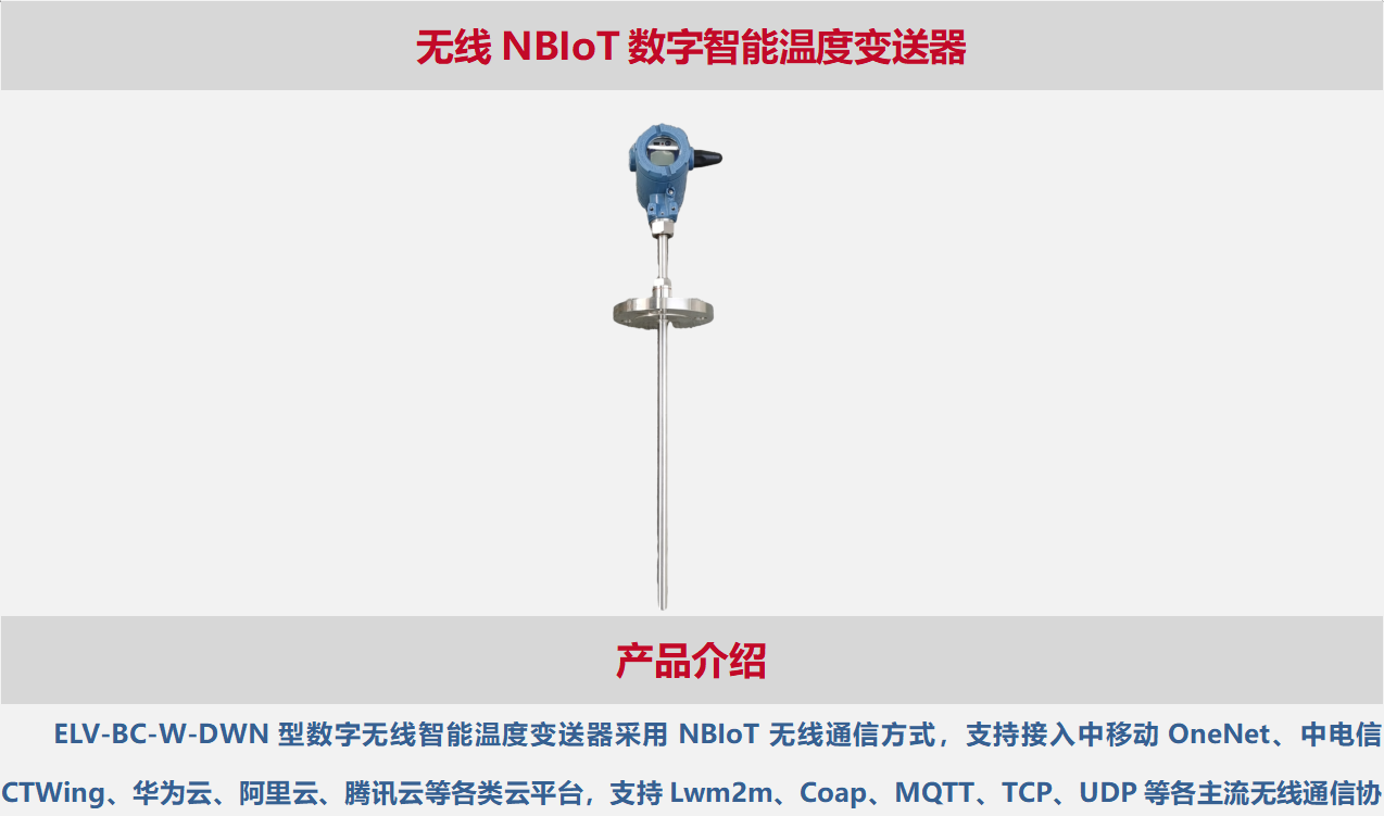 ELV-BC-W-DWN型数字无线智能温度变送器采用NBIoT无线通信方式,支持接入中移动OneNet、中电信CTWing、华为云、阿里云、腾讯云等各类云平台,支持Lwm2m、Coap、MQTT、TCP、UDP等各主流无线通信协议,支持协议定制,基于运营商网络体系,配合各类应用场景需要构建物联网数字接入系统,实现应用场景的数字化建设。变送器外形简洁、显示直观、操作方便,具备耐腐蚀、耐振动、抗冲击等特性,支持多种安装应用方式,是成熟稳定的新一代智能型数字温度测量仪表。