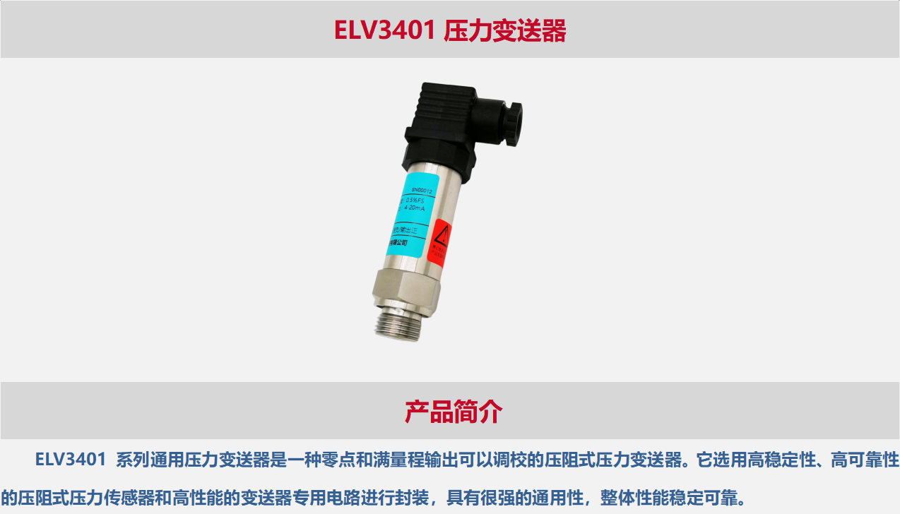 ELV3401系列通用压力变送器是一种零点和满量程输出可以调校的压阻式压力变送器。它选用高稳定性、高可靠性的压阻式压力传感器和高性能的变送器专用电路进行封装,具有很强的通用性,整体性能稳定可靠。
