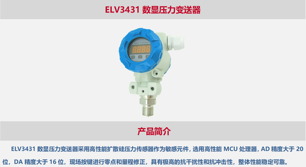 ELV3431数显压力变送器采用高性能扩散硅压力传感器作为敏感元件,选用高性能MCU处理器,AD精度大于20位,DA精度大于16位,现场按键进行零点和量程修正,具有极高的抗干扰性和抗冲击性,整体性能稳定可靠。