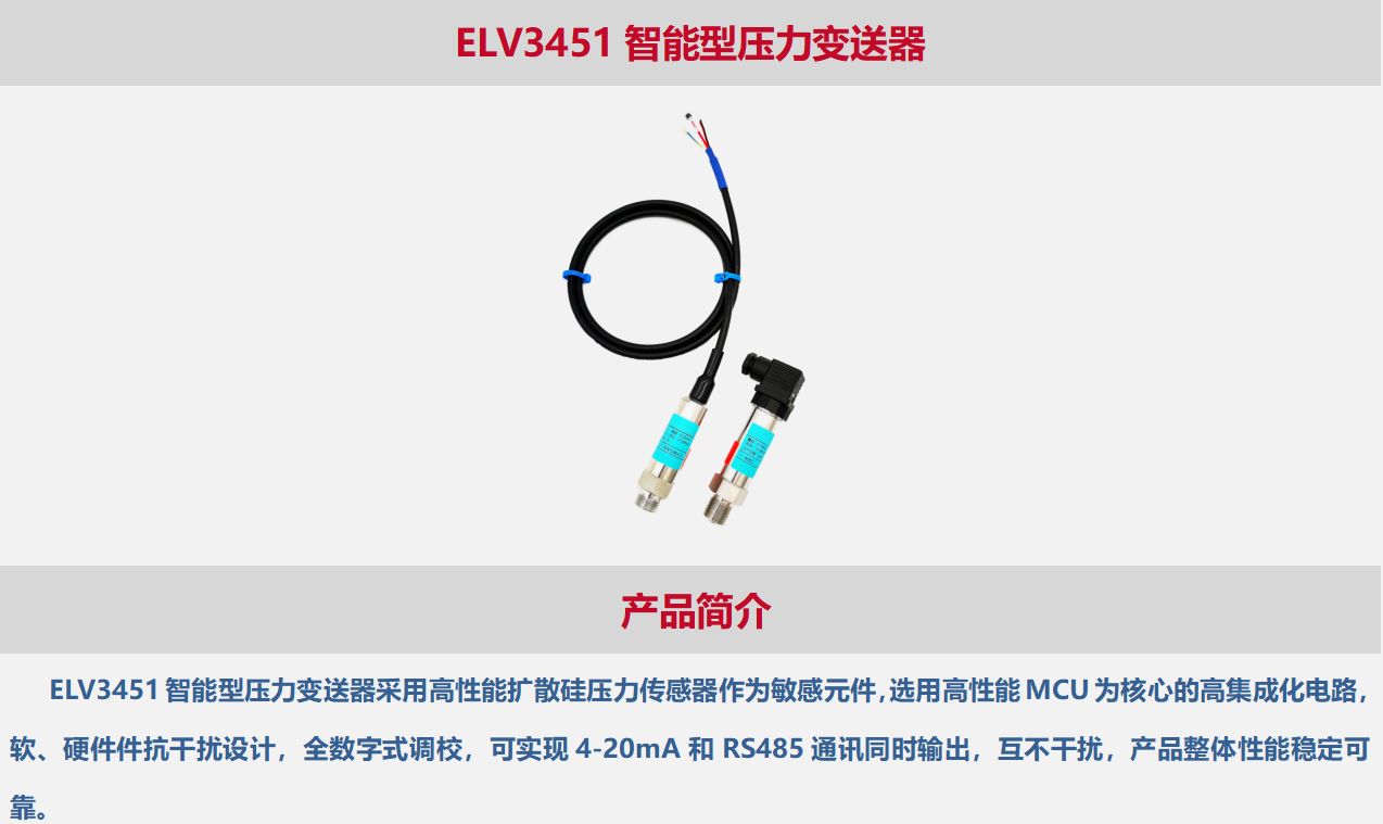 ELV3451智能型压力变送器采用高性能扩散硅压力传感器作为敏感元件,选用高性能MCU为核心的高集成化电路,软、硬件件抗干扰设计,全数字式调校,可实现4-20mA和RS485通讯同时输出,互不干扰,产品整体性能稳定可靠。
