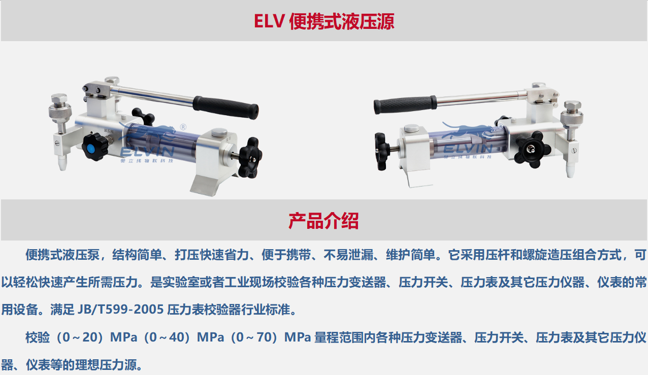 便携式液压泵,结构简单、打压快速省力、便于携带、不易泄漏、维护简单。它采用压杆和螺旋造压组合方式,可以轻松快速产生所需压力。是实验室或者工业现场校验各种压力变送器、压力开关、压力表及其它压力仪器、仪表的常用设备。满足JB/T599-2005压力表校验器行业标准。