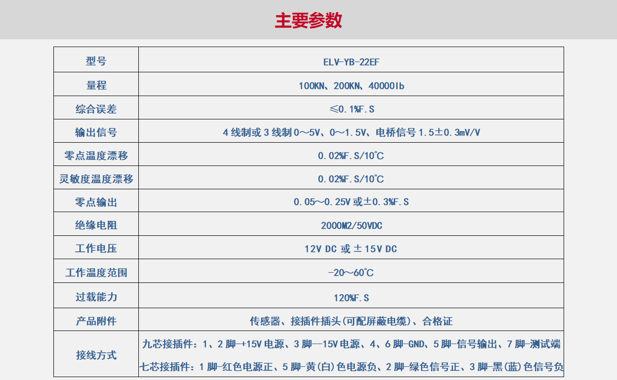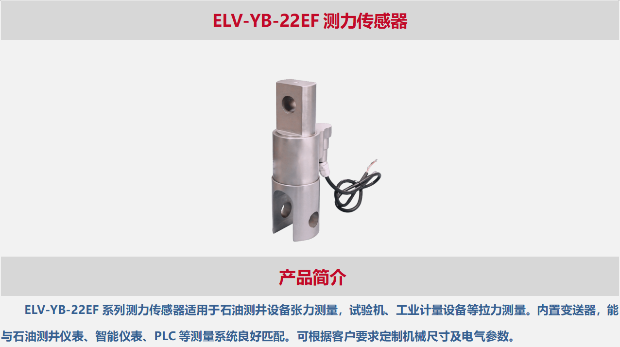 ELV-YB-22EF系列测力传感器适用于石油测井设备张力测量,试验机、工业计量设备等拉力测量。内置变送器,能与石油测井仪表、智能仪表、PLC等测量系统良好匹配。可根据客户要求定制机械尺寸及电气参数。