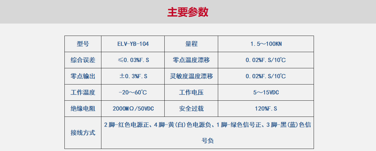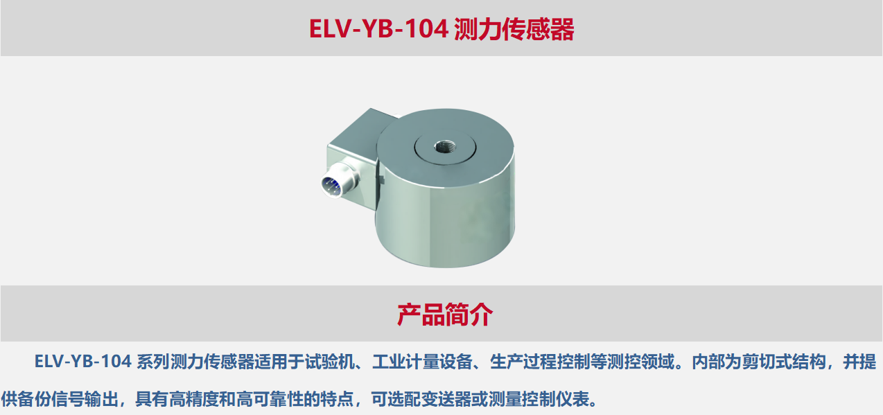 ELV-YB-104系列测力传感器适用于试验机、工业计量设备、生产过程控制等测控领域。内部为剪切式结构,并提供备份信号输出,具有高精度和高可靠性的特点,可选配变送器或测量控制仪表。