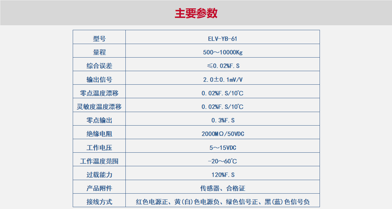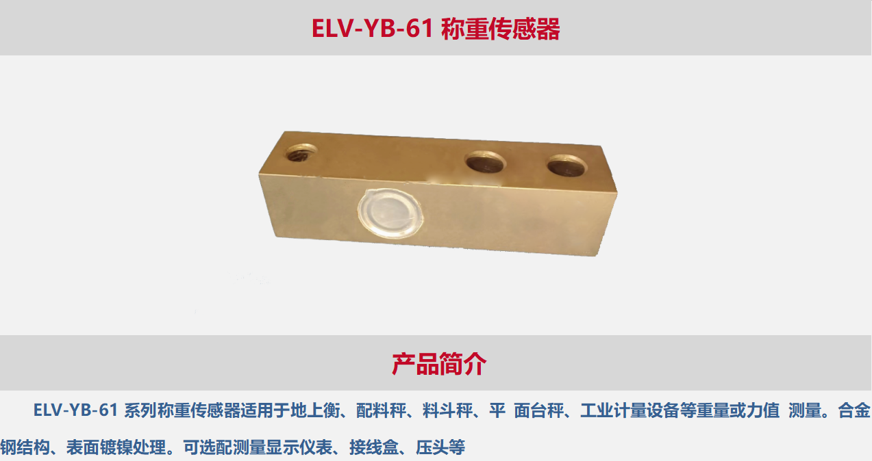 ELV-YB-61系列称重传感器适用于地上衡、配料秤、料斗秤、平 面台秤、工业计量设备等重量或力值 测量。合金钢结构、表面镀镍处理。可选配测量显示仪表、接线盒、压头等.
