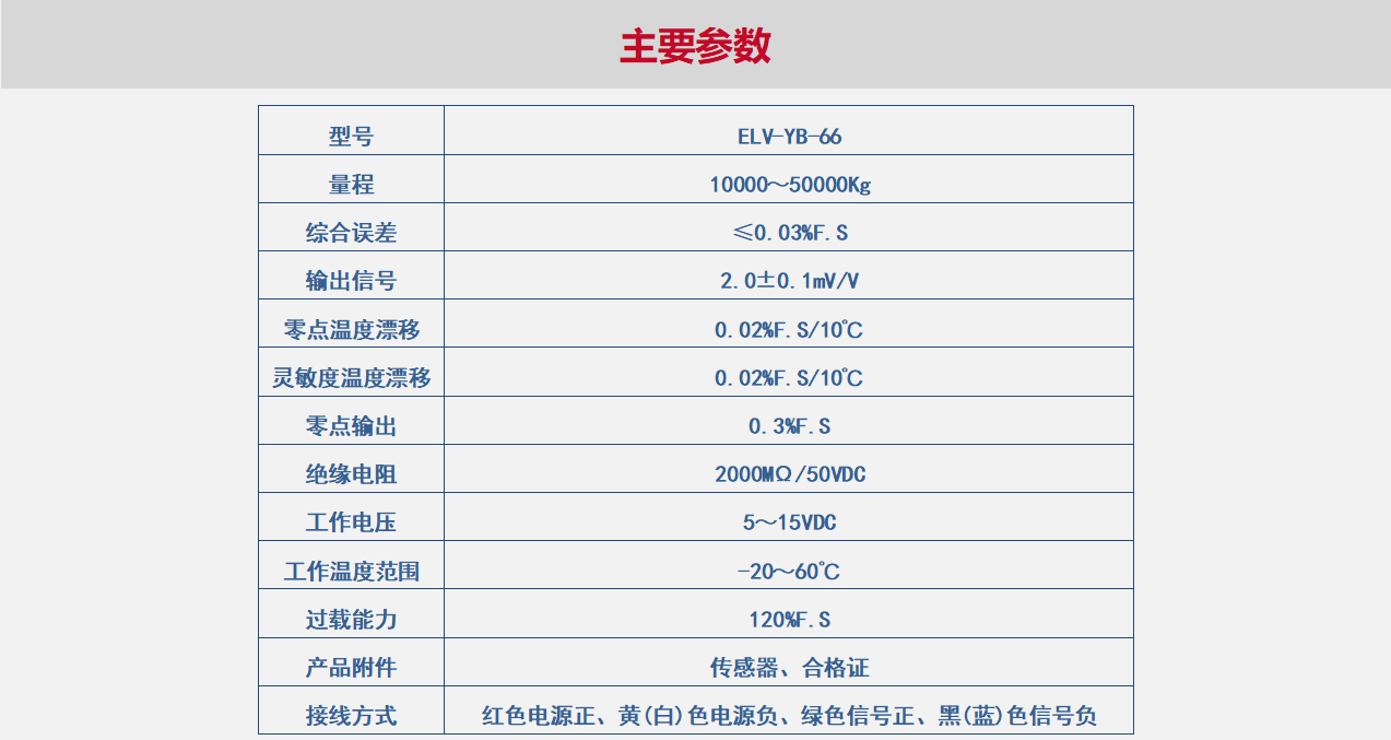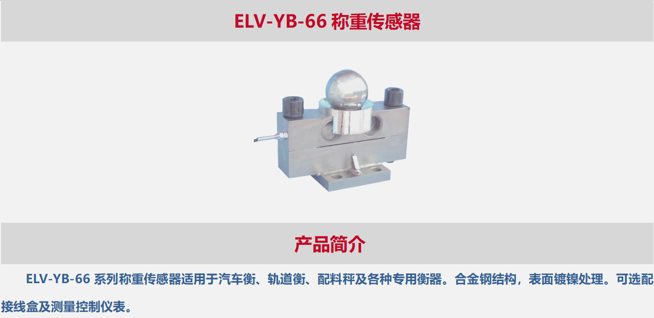 ELV-YB-66系列称重传感器适用于汽车衡、轨道衡、配料秤及各种专用衡器。合金钢结构,表面镀镍处理。可选配接线盒及测量控制仪表。