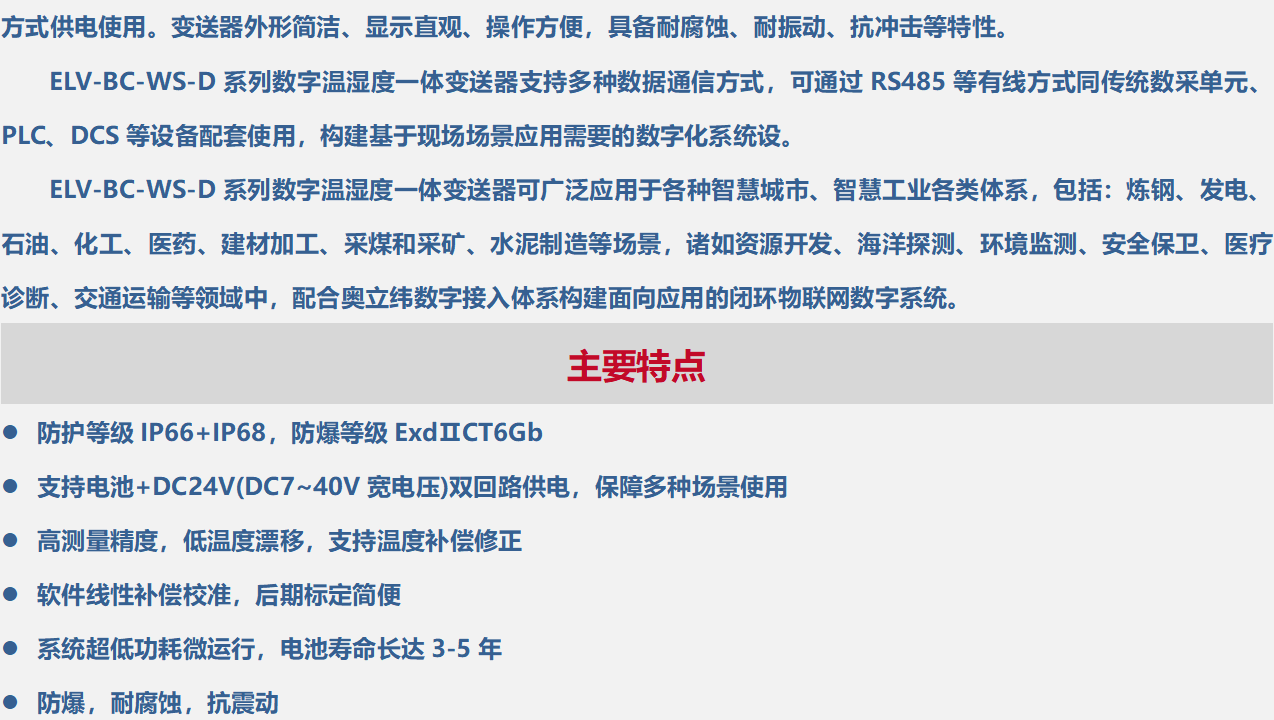 ELV-BC-WS-DR型RS485数字温湿度一体变送器是我司针对智慧城市、智慧工业场景下,数字化建设中,对环境中温湿度、大气压实时监测的数字智能设备。产品采用32位微处理器,先进的低功耗处理技术使设备更节能,支持电池方式供电使用。变送器外形简洁、显示直观、操作方便,具备耐腐蚀、耐振动、抗冲击等特性。