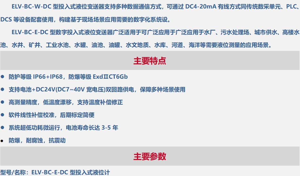 ELV-BC-E-DC型投入式液位变送器采用高性能扩散硅传感器做为测量元件,将与液体深度成正比的静压通过算法转化为液位输出数据。ELV-BC-E-DC型投入式液位变送器外形简洁、显示直观、操作方便,具备耐腐蚀、耐振动、抗冲击等特性.