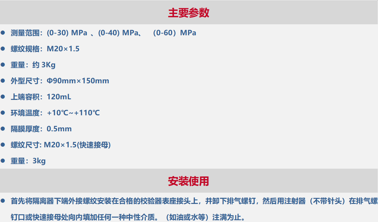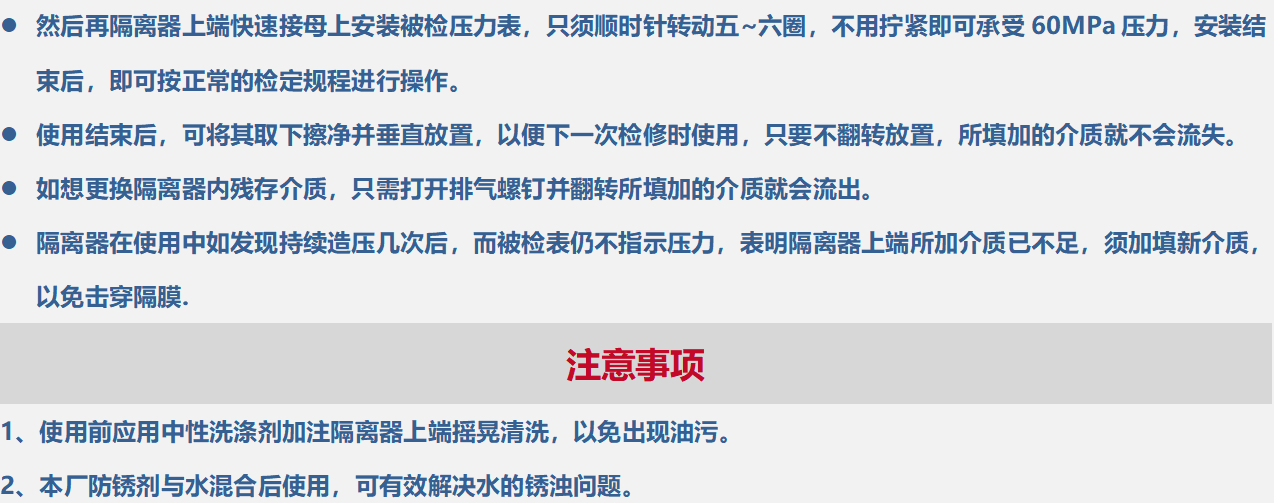 主要用于氧气表、乙炔表检修时作隔离使用。同时,由于此隔离器已将上下两种(或同种)液体介质经过隔离后也可起到设备保养、清洁、隔离污染、腐蚀的作用。
