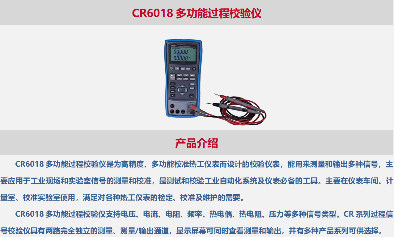 CR6018多功能过程校验仪是为高精度、多功能校准热工仪表而设计的校验仪表,能用来测量和输出多种信号,主要应用于工业现场和实验室信号的测量和校准,是测试和校验工业自动化系统及仪表必备的工具。主要在仪表车间、计量室、校准实验室使用,满足对各种热工仪表的检定、校准及维护的需要。