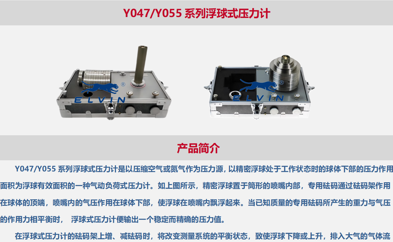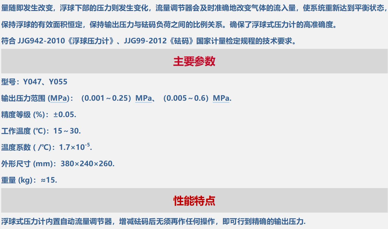 Y047/Y055系列浮球式压力计是以压缩空气或氮气作为压力源,以精密浮球处于工作状态时的球体下部的压力作用面积为浮球有效面积的一种气动负荷式压力计。如上图所示,精密浮球置于筒形的喷嘴内部,专用砝码通过砝码架作用在球体的顶端,喷嘴内的气压作用在球体下部,使浮球在喷嘴内飘浮起来。当已知质量的专用砝码所产生的重力与气压的作用力相平衡时, 浮球式压力计便输出一个稳定而精确的压力值。