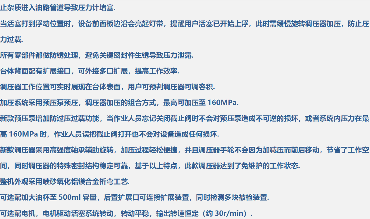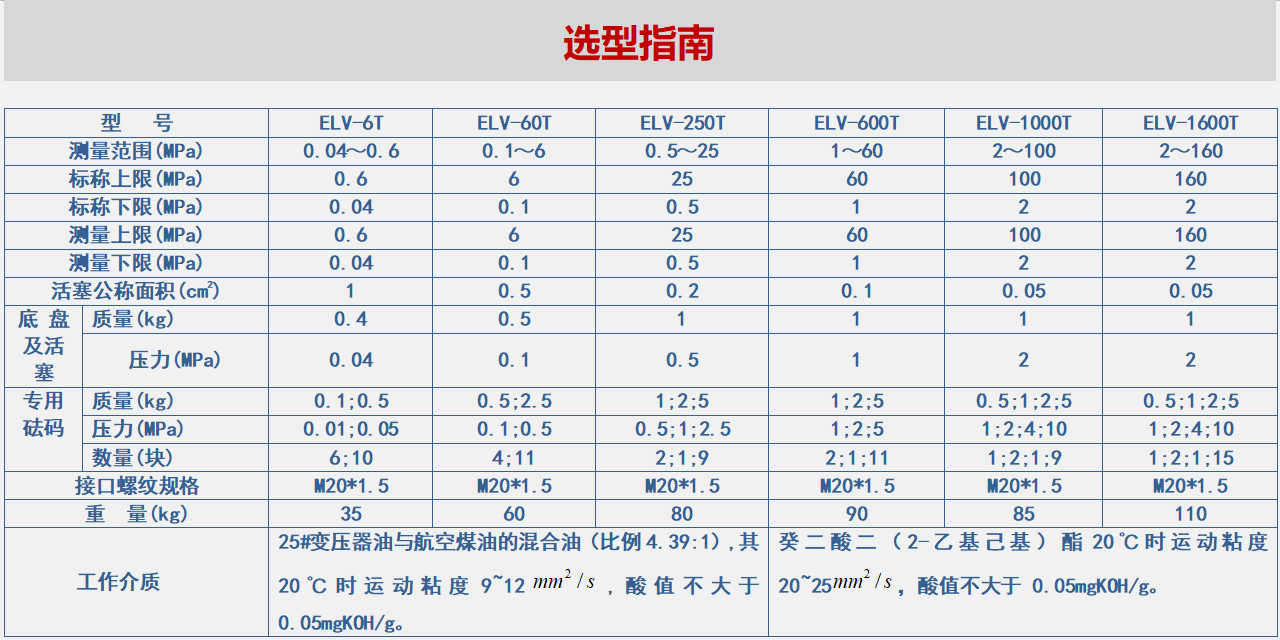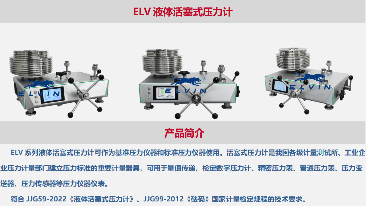 ELV系列液体活塞式压力计可作为基准压力仪器和标准压力仪器使用。活塞式压力计是我国各级计量测试所、工业企业压力计量部门建立压力标准的重要计量器具,可用于量值传递,检定数字压力计、精密压力表、普通压力表、压力变送器、压力传感器等压力仪器仪表。