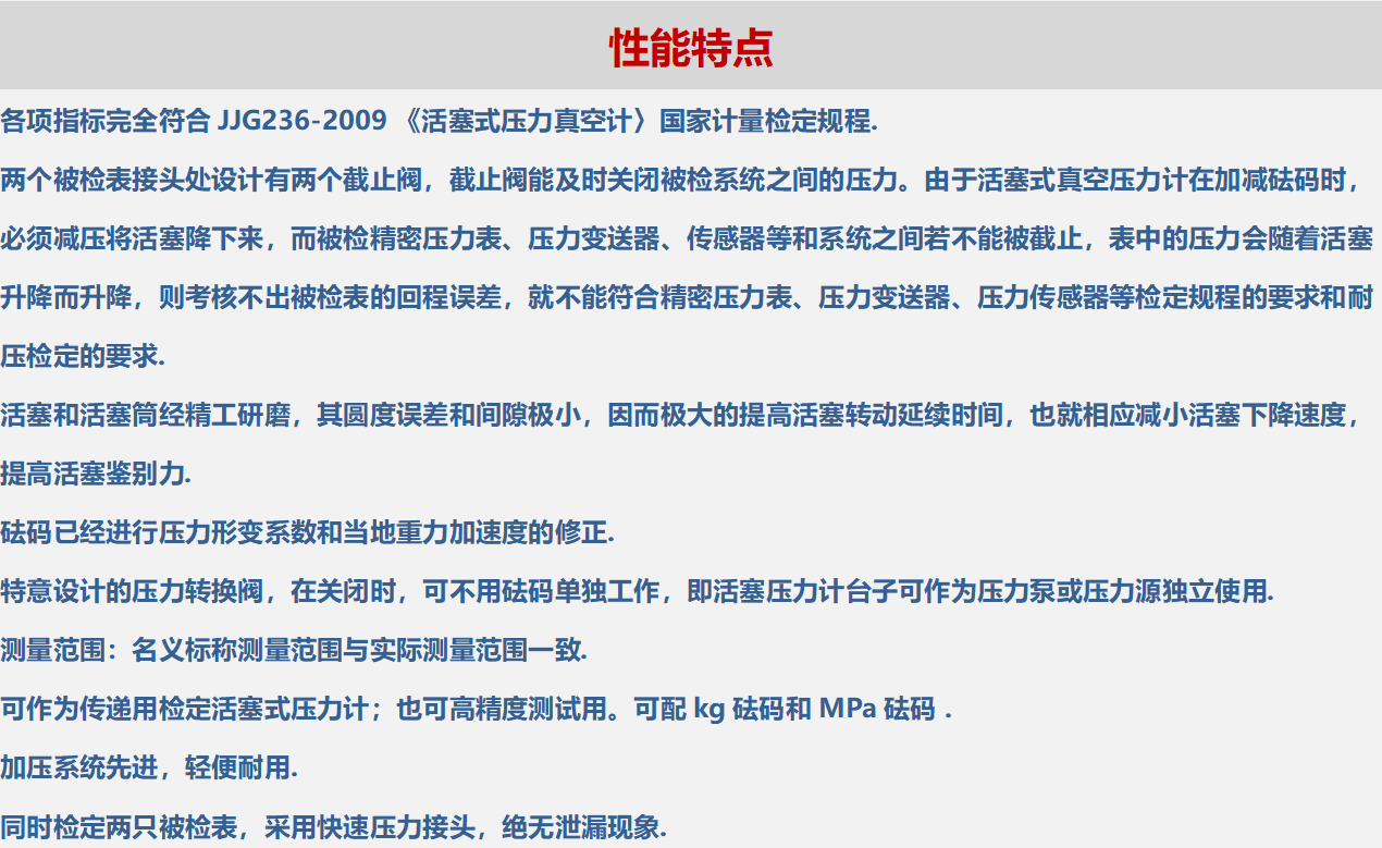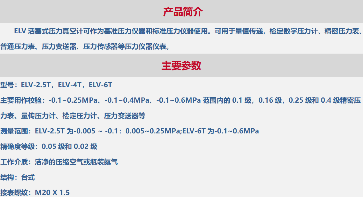 ELV活塞式压力真空计可作为基准压力仪器和标准压力仪器使用。可用于量值传递,检定数字压力计、精密压力表、普通压力表、压力变送器、压力传感器等压力仪器仪表。