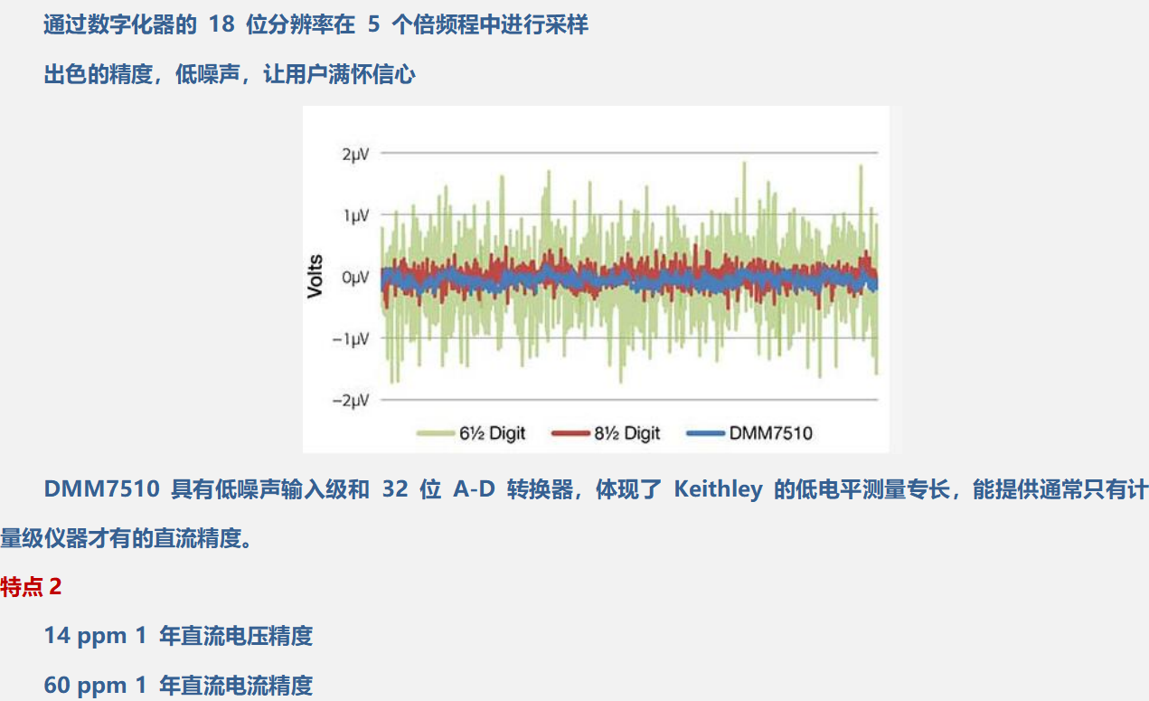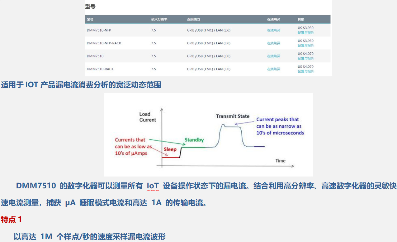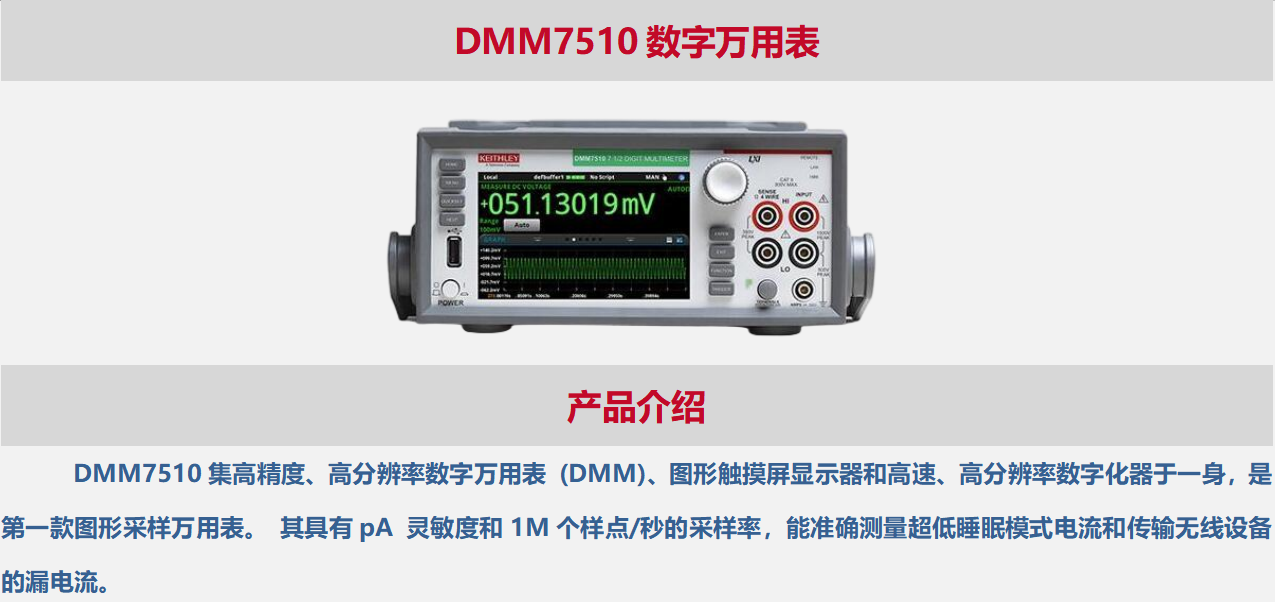 DMM7510集高精度、高分辨率数字万用表 (DMM)、图形触摸屏显示器和高速、高分辨率数字化器于一身,是第一款图形采样万用表。 其具有pA 灵敏度和1M个样点/秒的采样率,能准确测量超低睡眠模式电流和传输无线设备的漏电流。