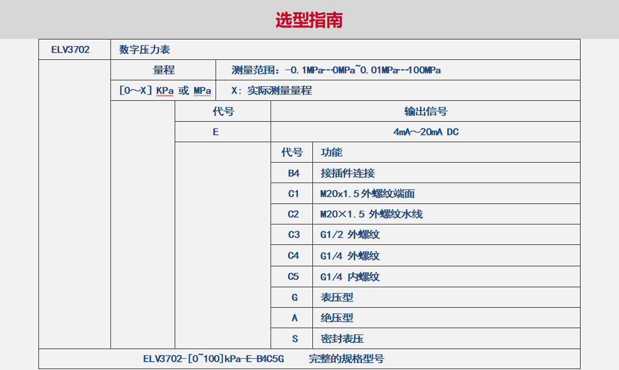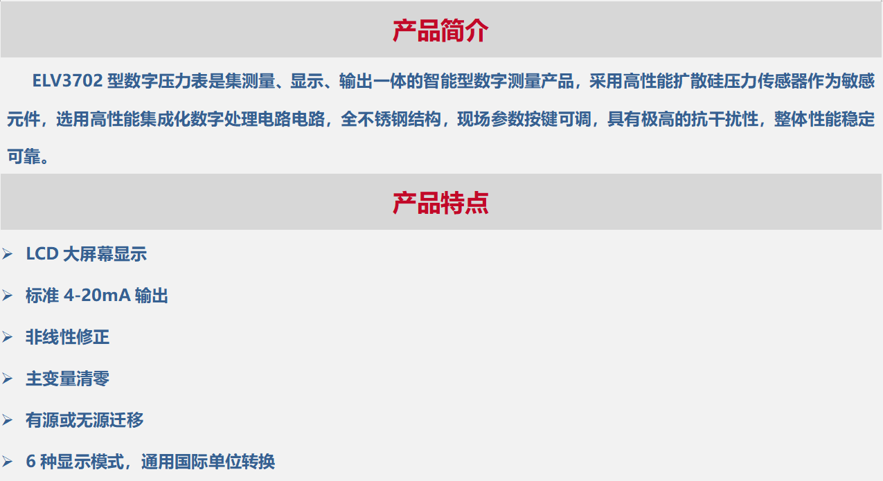 ELV3702型数字压力表是集测量、显示、输出一体的智能型数字测量产品,采用高性能扩散硅压力传感器作为敏感元件,选用高性能集成化数字处理电路电路,全不锈钢结构,现场参数按键可调,具有极高的抗干扰性,整体性能稳定可靠。