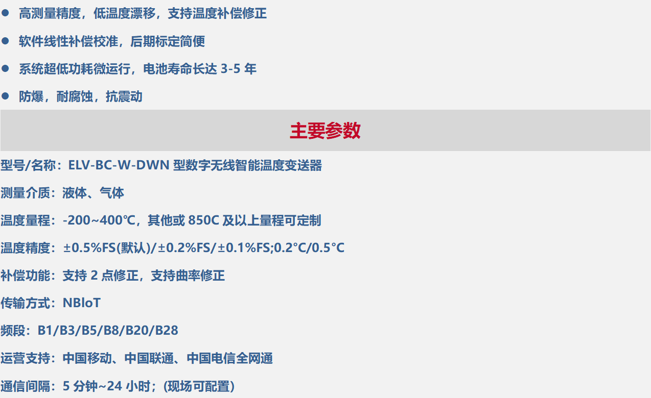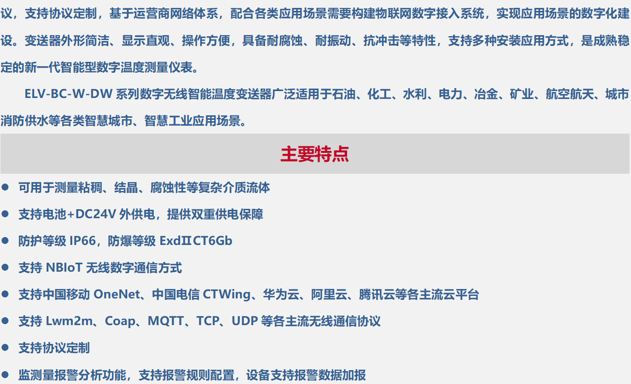 ELV-BC-W-DWN型数字无线智能温度变送器采用NBIoT无线通信方式,支持接入中移动OneNet、中电信CTWing、华为云、阿里云、腾讯云等各类云平台,支持Lwm2m、Coap、MQTT、TCP、UDP等各主流无线通信协议,支持协议定制,基于运营商网络体系,配合各类应用场景需要构建物联网数字接入系统,实现应用场景的数字化建设。变送器外形简洁、显示直观、操作方便,具备耐腐蚀、耐振动、抗冲击等特性,支持多种安装应用方式,是成熟稳定的新一代智能型数字温度测量仪表。