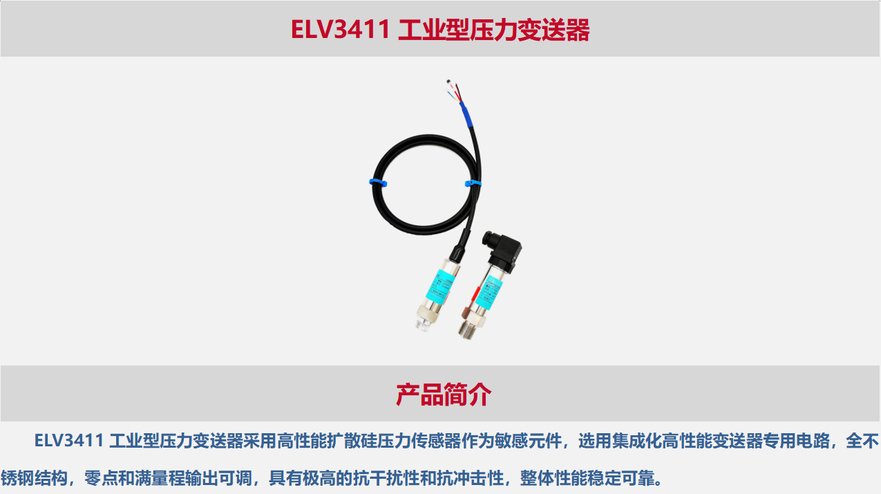 ELV3411工业型压力变送器采用高性能扩散硅压力传感器作为敏感元件,选用集成化高性能变送器专用电路,全不锈钢结构,零点和满量程输出可调,具有极高的抗干扰性和抗冲击性,整体性能稳定可靠。