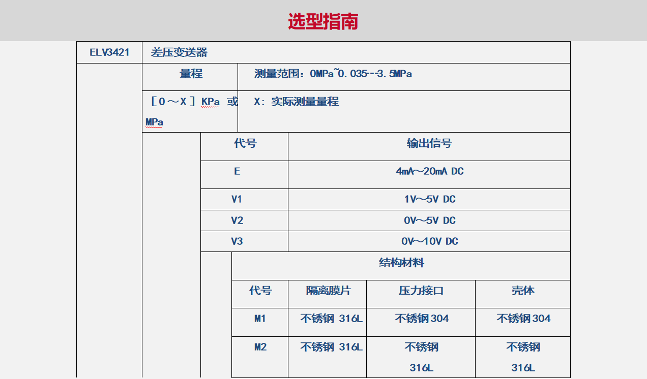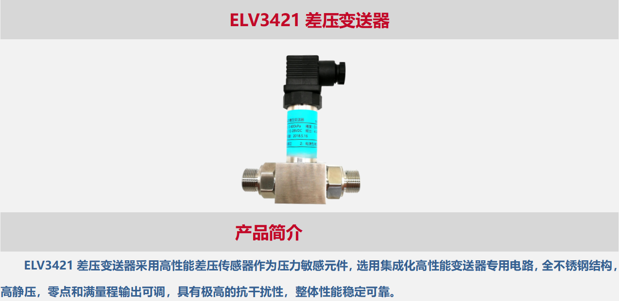 ELV3421差压变送器采用高性能差压传感器作为压力敏感元件,选用集成化高性能变送器专用电路,全不锈钢结构,高静压,零点和满量程输出可调,具有极高的抗干扰性,整体性能稳定可靠。