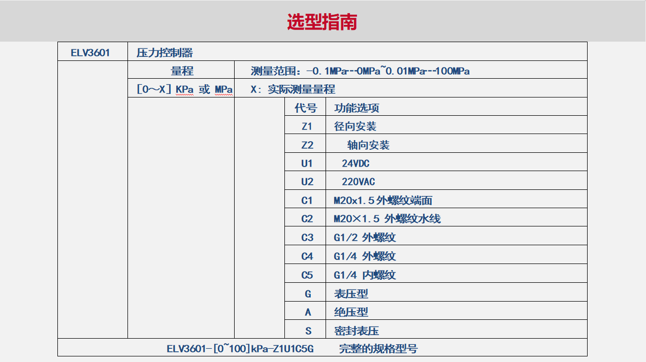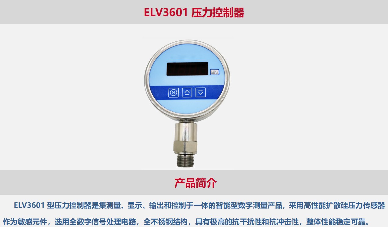 ELV3601型压力控制器是集测量、显示、输出和控制于一体的智能型数字测量产品,采用高性能扩散硅压力传感器作为敏感元件,选用全数字信号处理电路,全不锈钢结构,具有极高的抗干扰性和抗冲击性,整体性能稳定可靠。