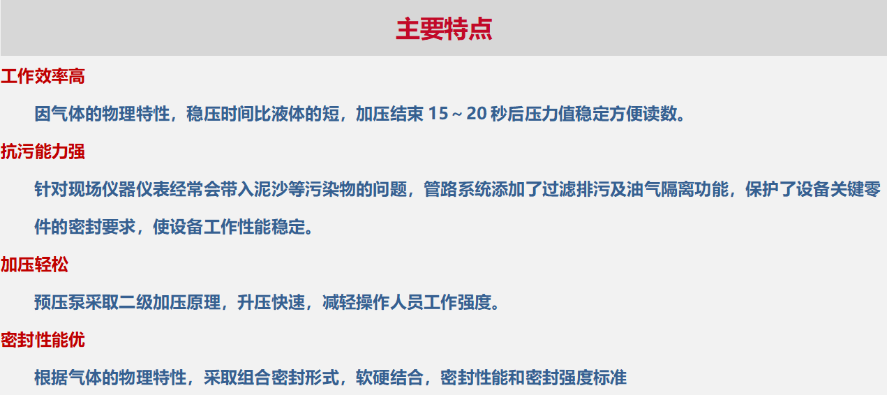 ELV-6Q手动气压源,结构简单、稳压快速。它采用压杆预压,螺旋加压的组合结构,可以提供稳定、可靠的所需压力,可协助实验室或者工业现场对(-0.095~6)MPa校验压力变送器、压力开关、压力表、压力传感器等。满足压力表校验器行业标准。
